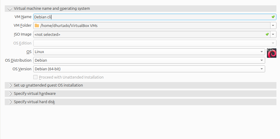 Una vez dentro de oracle Virtualbox fem click a new, per crear una nova mv, al clickar new s’obrira una nova pestanya on en la ISO image, posarem la ISO proprocionada per el professorat (la que hem hagafat en el filezilla, com a nom jo li vaig posar debian grup1 repte1)