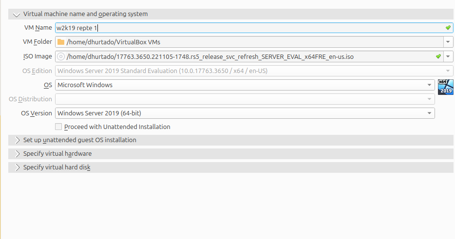 Una vez dentro de oracle Virtualbox fem click a new, per crear una nova mv, al clickar new s’obrira una nova pestanya on en la ISO image, posarem la ISO proprocionada per el professorat (la que hem hagafat en el filezilla, com a nom jo li vaig posar w2k19 repte1)
