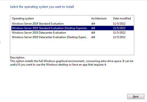 En aquest cas al ser w2k19, instal·lem la “17763.3650.221105-1748.rs5_release_svc_refresh_SERVER_EVAL_x64FRE_en-us.iso” es la que ens van dir per chat el professor