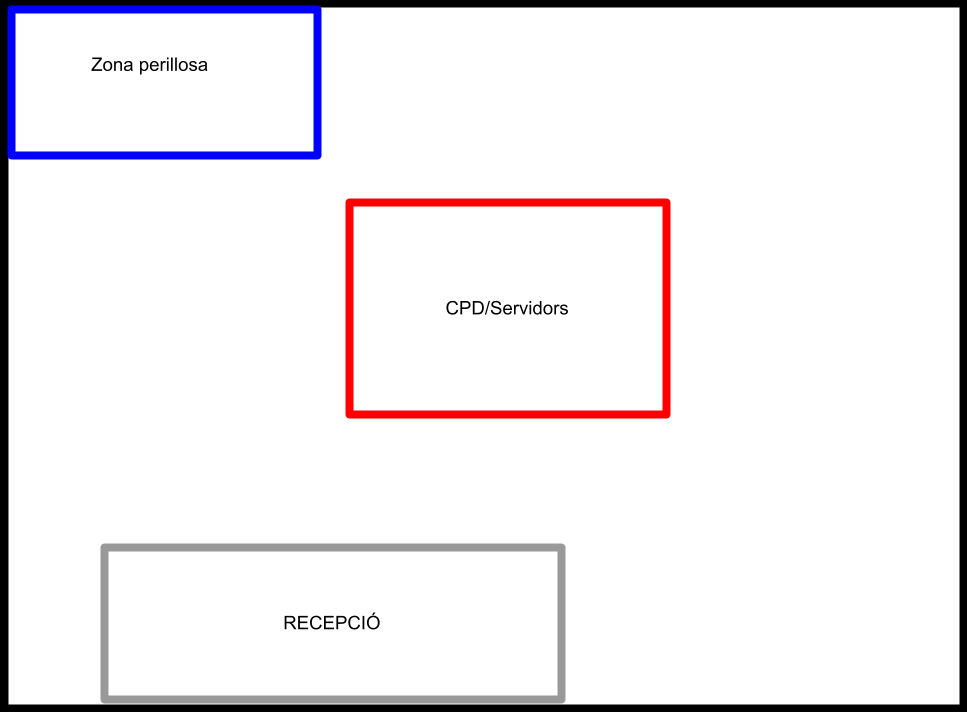 2. Ubicació Escollida: Zona Central Interior Hem situat el Centre de Processament de Dades (CPD) a la zona central de l’oficina (marcada en vermell al plànol), aïllada de les parets exteriors. Aquesta decisió es fonamenta en tres pilars de seguretat: