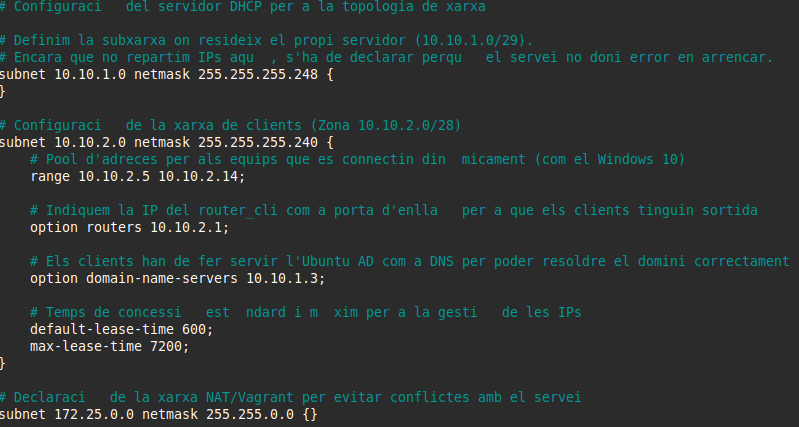 S’ha optat per configurar una assignació d’adreces IP de forma totalment dinàmica per a la zona de clients (xarxa 10.10.2.0/28) per criteris d’eficiència i escalabilitat.
