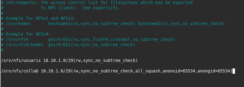 /srv/nfs/collab 10.10.1.0/29(rw,sync,no_subtree_check,all_squash,anonuid=65534,anongid=65534)